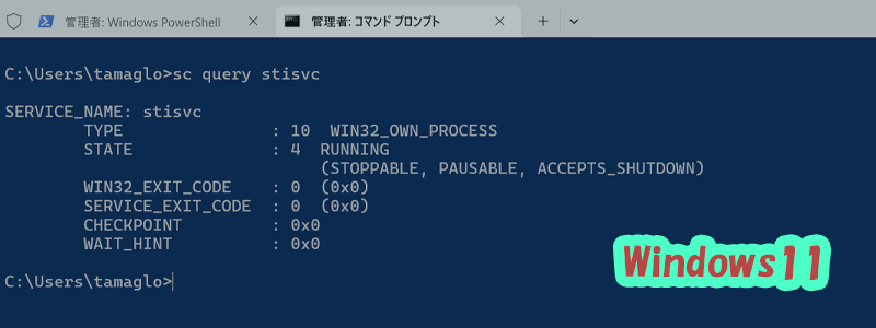 再び sc query stisvc を実行して「STATE: 4 RUNNING」になっていれば、スキャナーの利用準備が整った状態です。