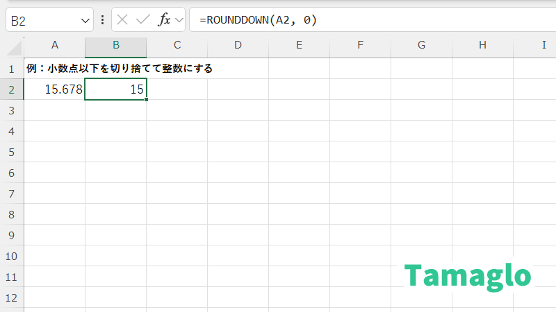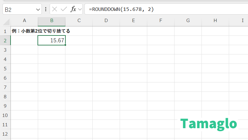 =ROUNDDOWN(15.678, 2) → 結果:15.67