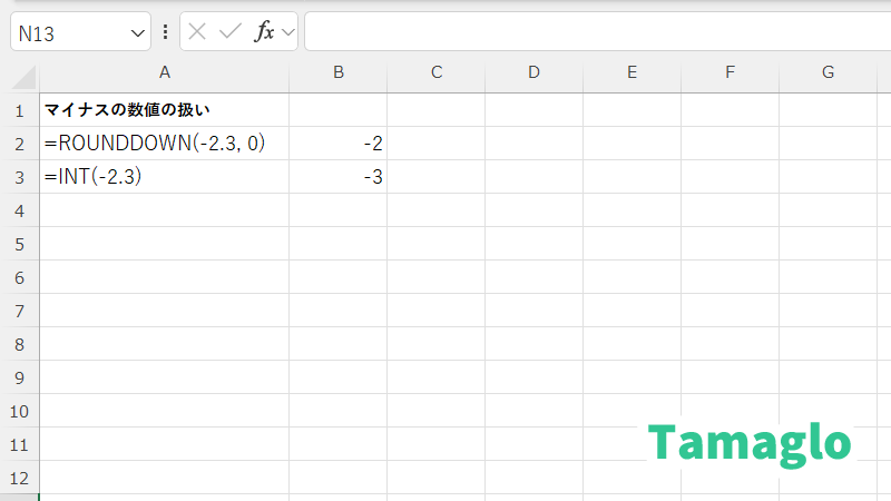 INT関数は常に「負の方向」に切り捨てるため、=INT(-2.3)の結果は-2ではなく-3になる。 - ROUNDDOWNとの違い