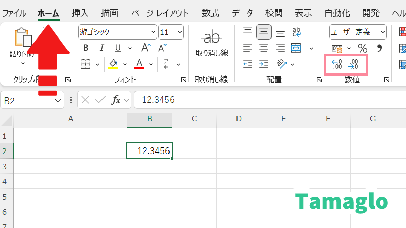 表示桁数の変更手順(ホームタブ)