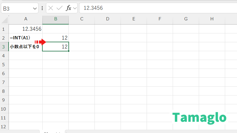 → 内部的な値は 12.3456 のまま - INT関数で