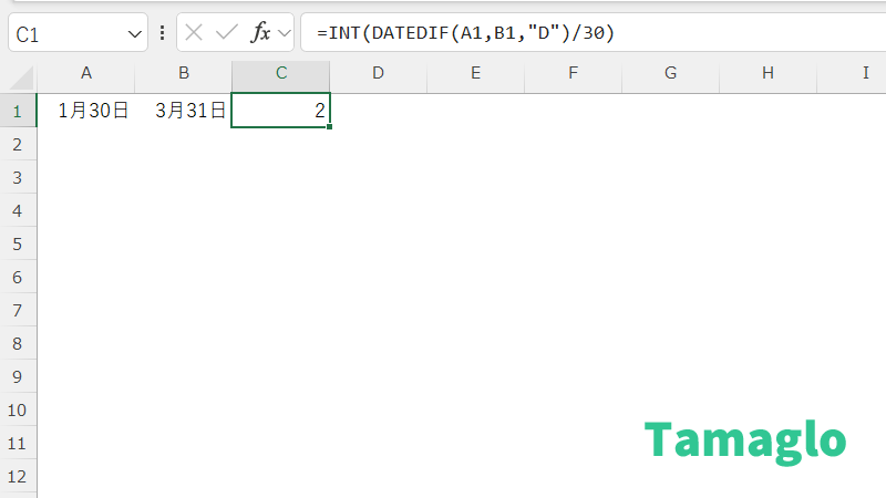 開始日 A1 と終了日 B1 のあいだの日数を求め、それを30で割っておおよその月数を算出し、INTで整数にしています。