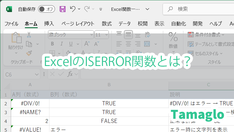 ISERROR関数とサンプルの使用例。TRUE、FALSE、エラー文字列表示など状況に応じて表示可能