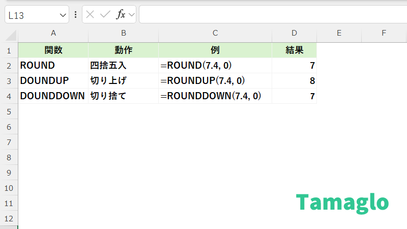 | ROUNDUP | 切り上げ | =ROUNDUP(7.4, 0) | 8 |