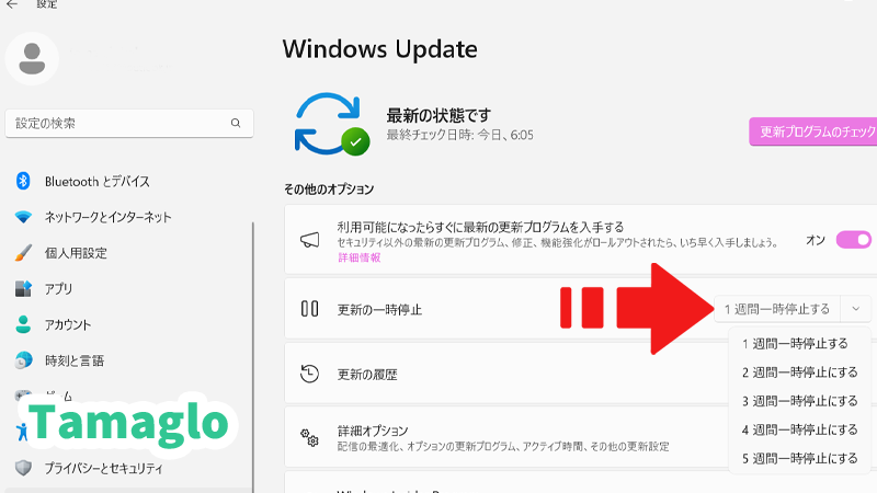 - 「更新の一時停止」を選び、最大5週間まで延期可能