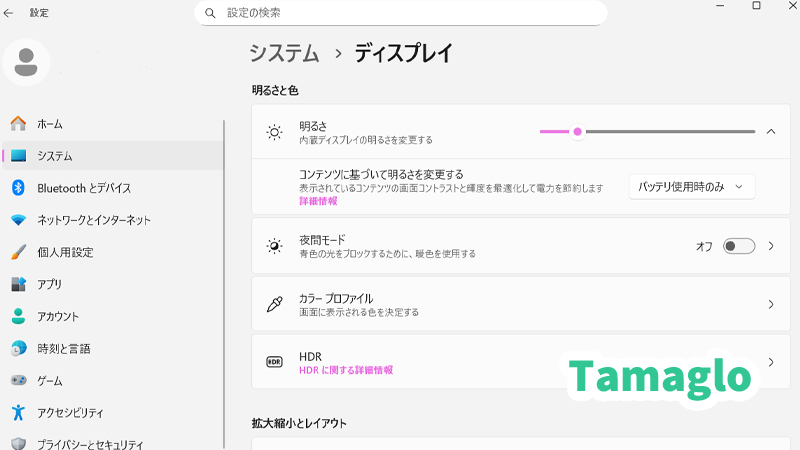 - 「設定」→「システム」→「ディスプレイ」