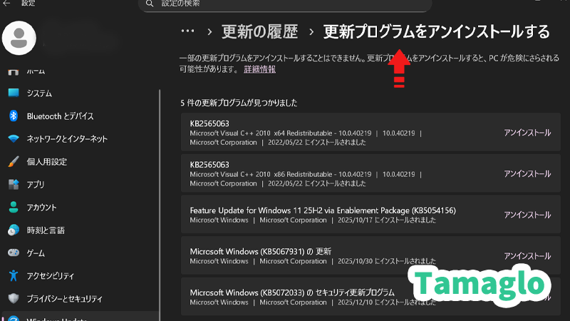 - 「2025-12 累積更新プログラム(KB5072033)」をインストール