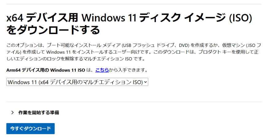 - ページ内の「x64 デバイス用 Windows 11 ディスク イメージ (ISO) をダウンロードする」から「Windows 11(マルチエディション)」を選択