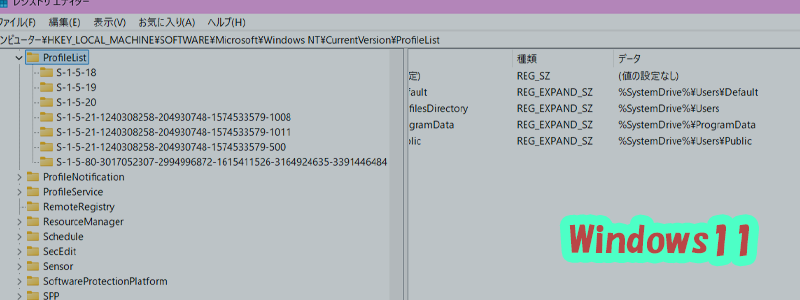 S-1-5-21-xxxxx...という名前のキーが並んでいます.bakが付いているキーがあれば、それが一時プロファイル用ですProfileImagePathの値で、それぞれがどのユーザーに対応しているか確認できます