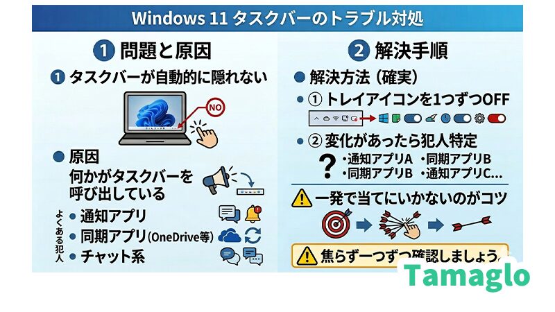 特に、アプリの起動や切り替えを頻繁に行う人にとって、タスクバーは単なる表示ではなく“作業の司令塔”です。ここが自分の操作に合っていないだけで、集中力や効率は目に見えて落ちていきます。