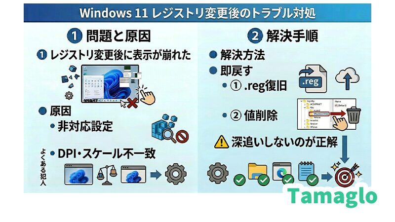 標準設定でできる最適化から、レジストリによる調整、外部ツールによる拡張、不具合が起きたときの復旧まで、すべて“戻せる前提”で整理しています。